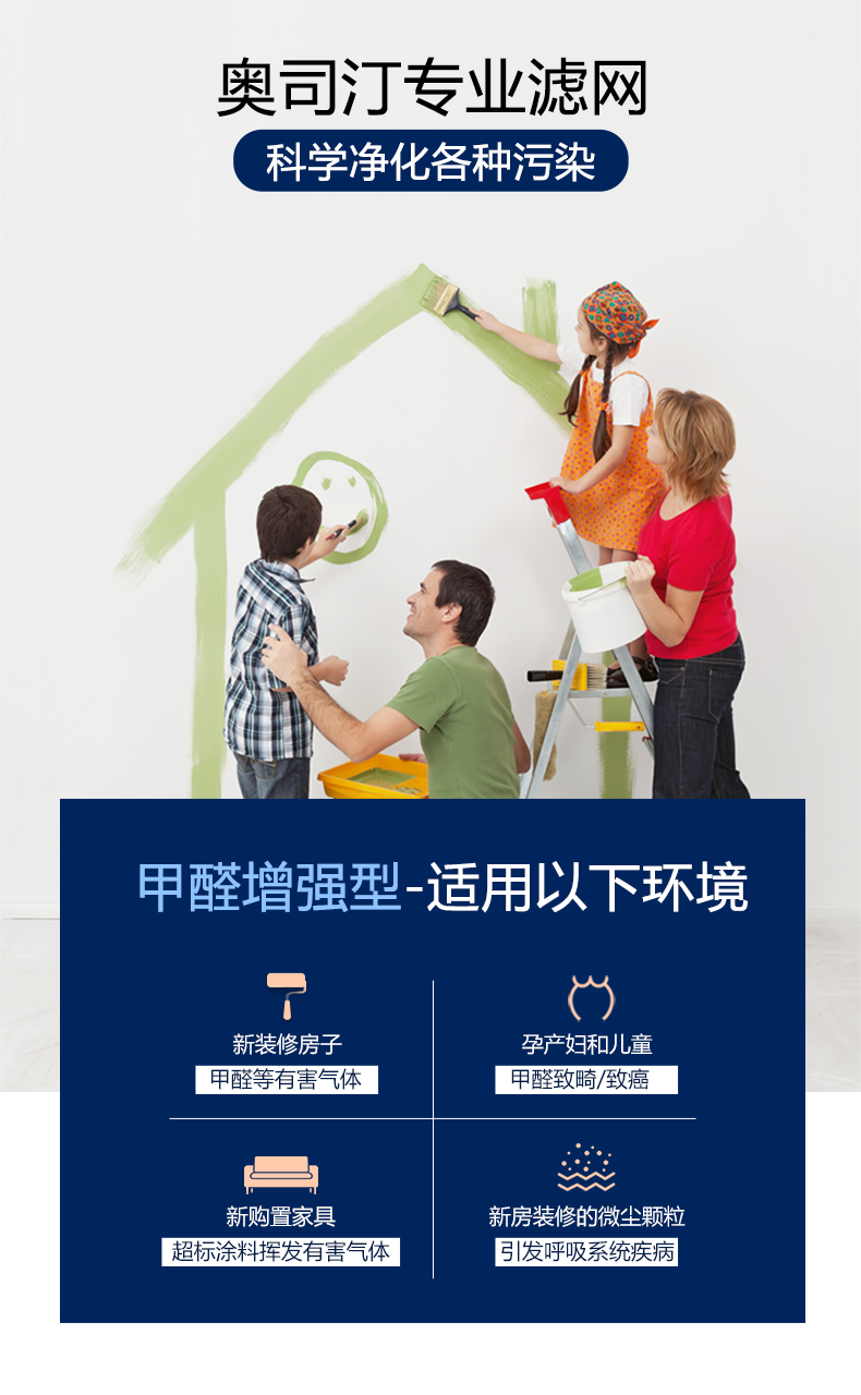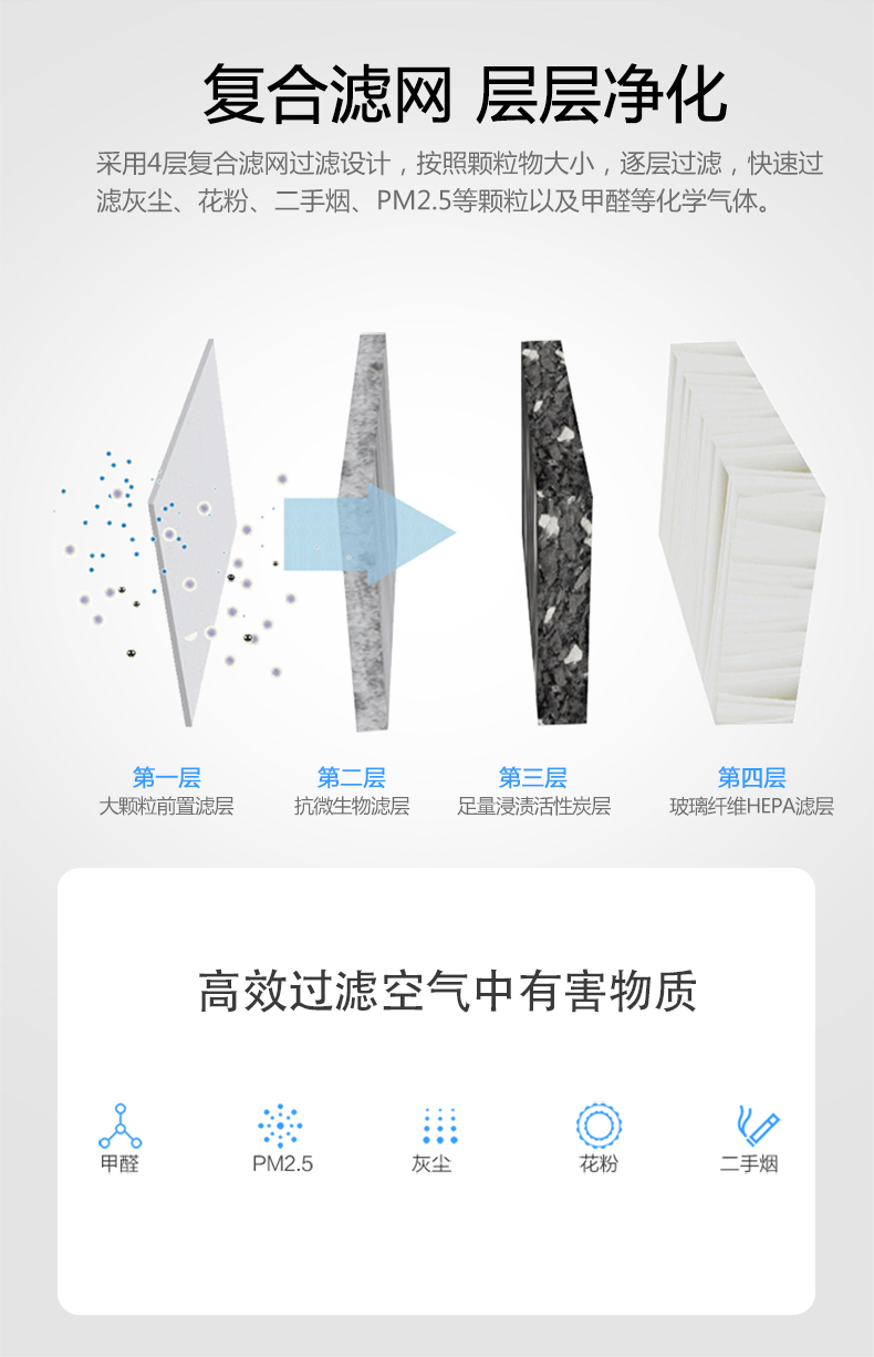 - 功能適用: 加強除甲醛/苯/TVOC/有毒有害化學氣體/煙味異味/除霾抑菌/防過敏源