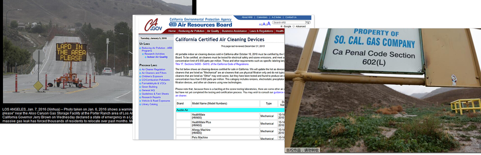 ● 2015年10月,美國加州洛杉磯發生嚴重天然氣泄漏。為確保公共呼吸健康安全,解決空氣污染問題,加利福尼亞空氣資源委員會(ARB)對市售的一百多個空氣凈化器產品進行嚴格測試評估后,推薦政府指定采購美國奧司汀空氣凈化器!ARB評估證明,美國奧司汀空氣凈化器能有效去除本次泄漏事故中空氣的甲烷、化學氣體和臭味,幫助居民有效緩解天然氣泄漏造成的不適。